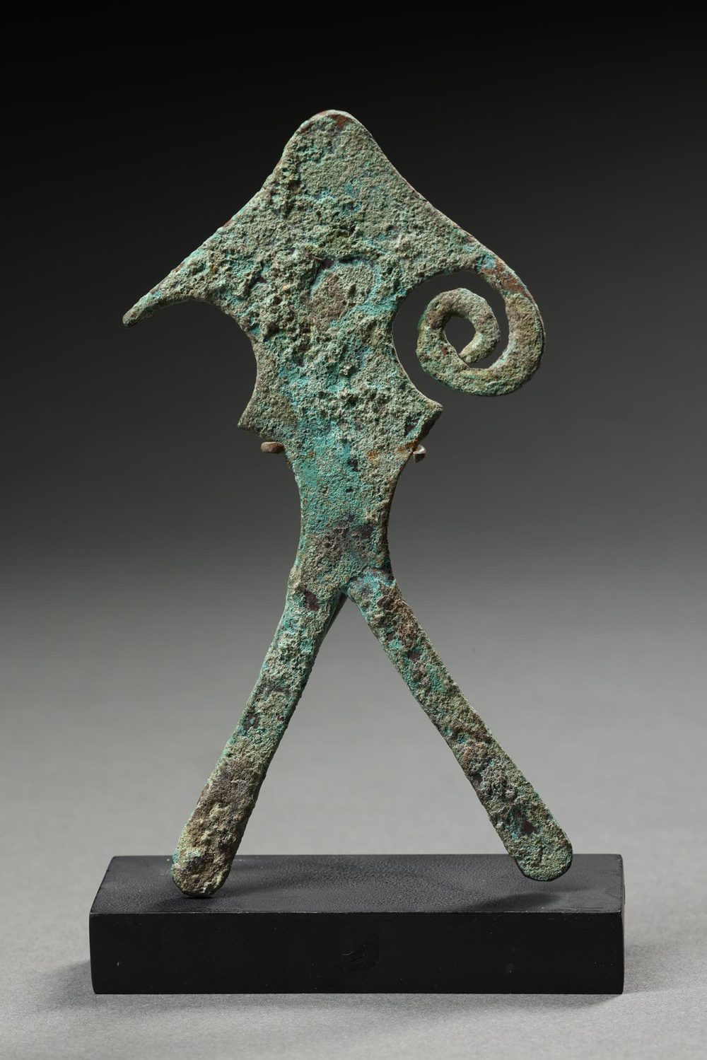 A celebrated abstract human figure in small scale, with a domical head, splayed legs, one arm that curl inwards, the other arm missing, perhaps sacrificed.