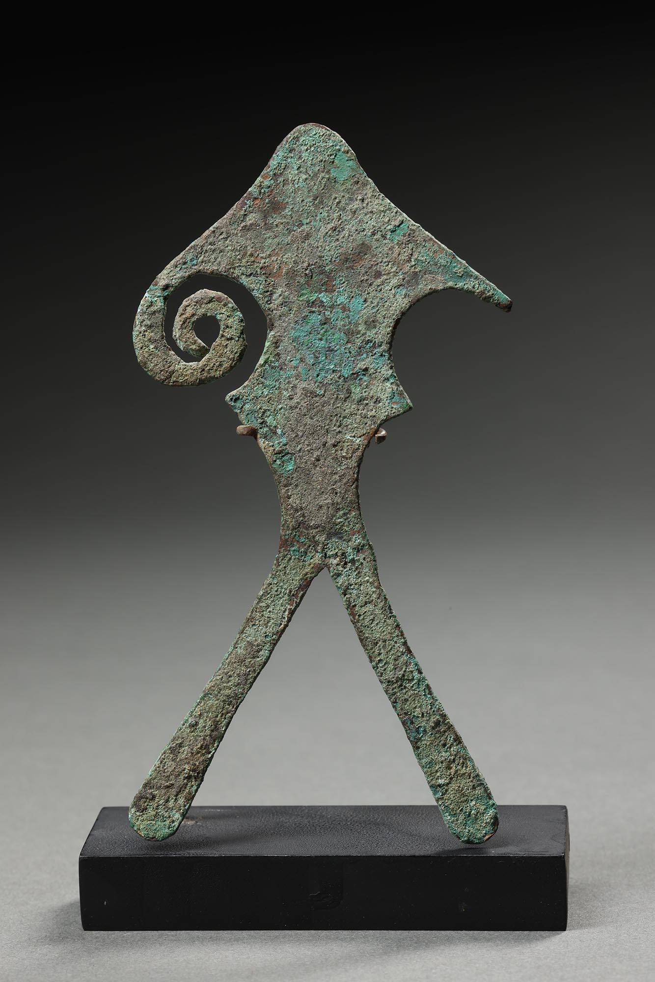A celebrated abstract human figure in small scale, with a domical head, splayed legs, one arm that curl inwards, the other arm missing, perhaps sacrificed.