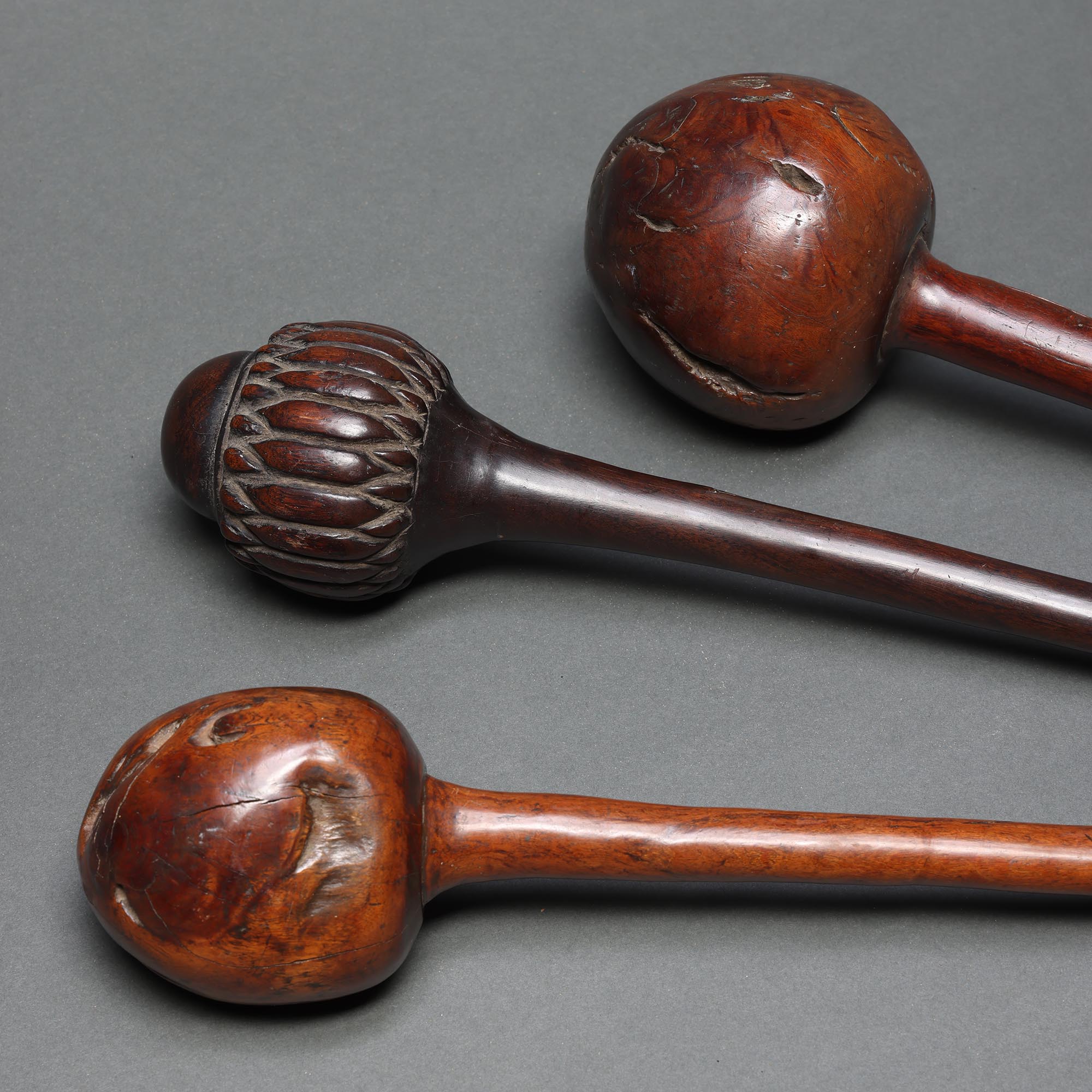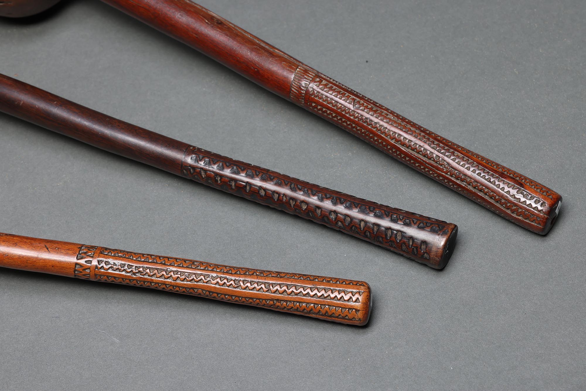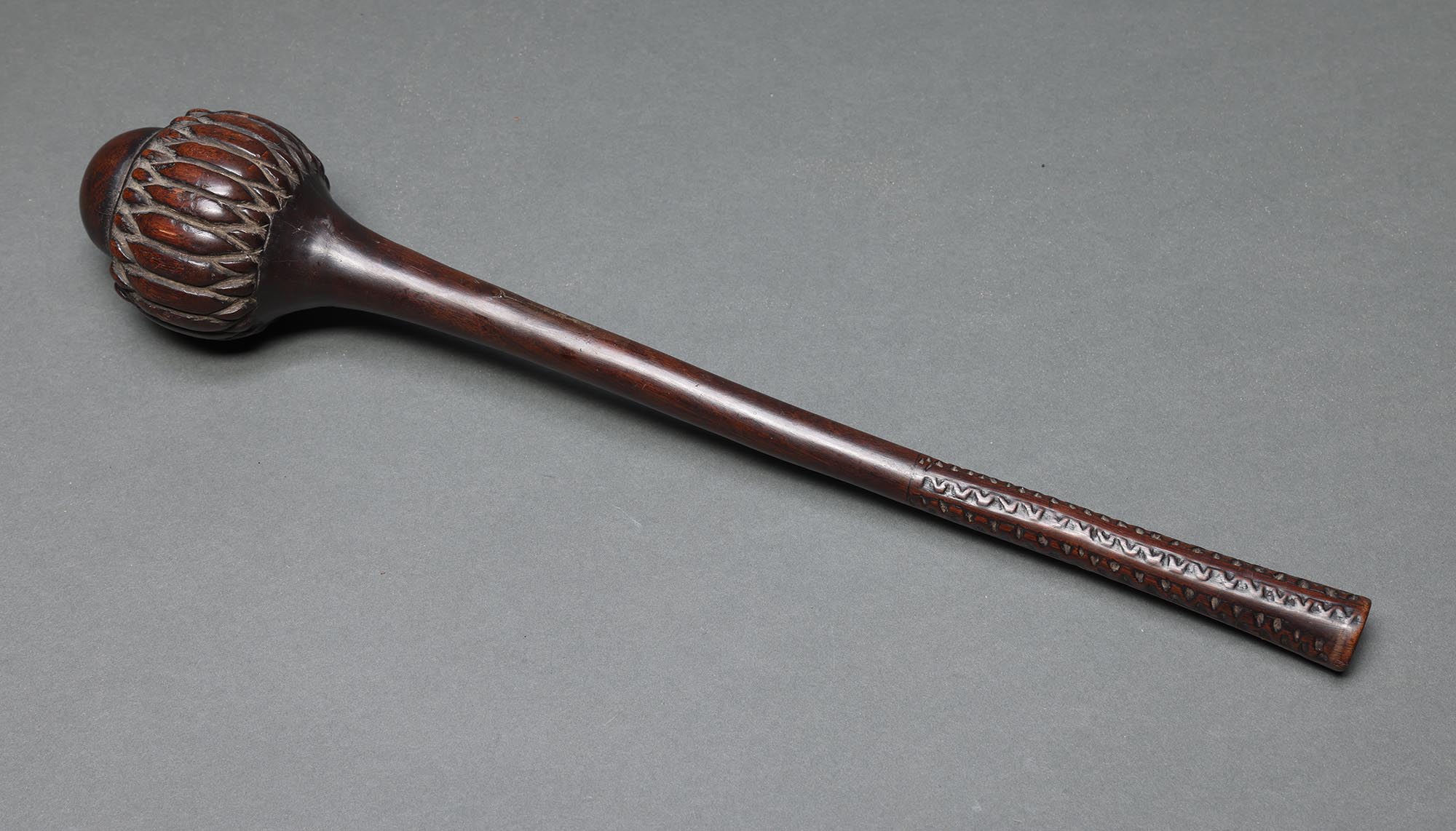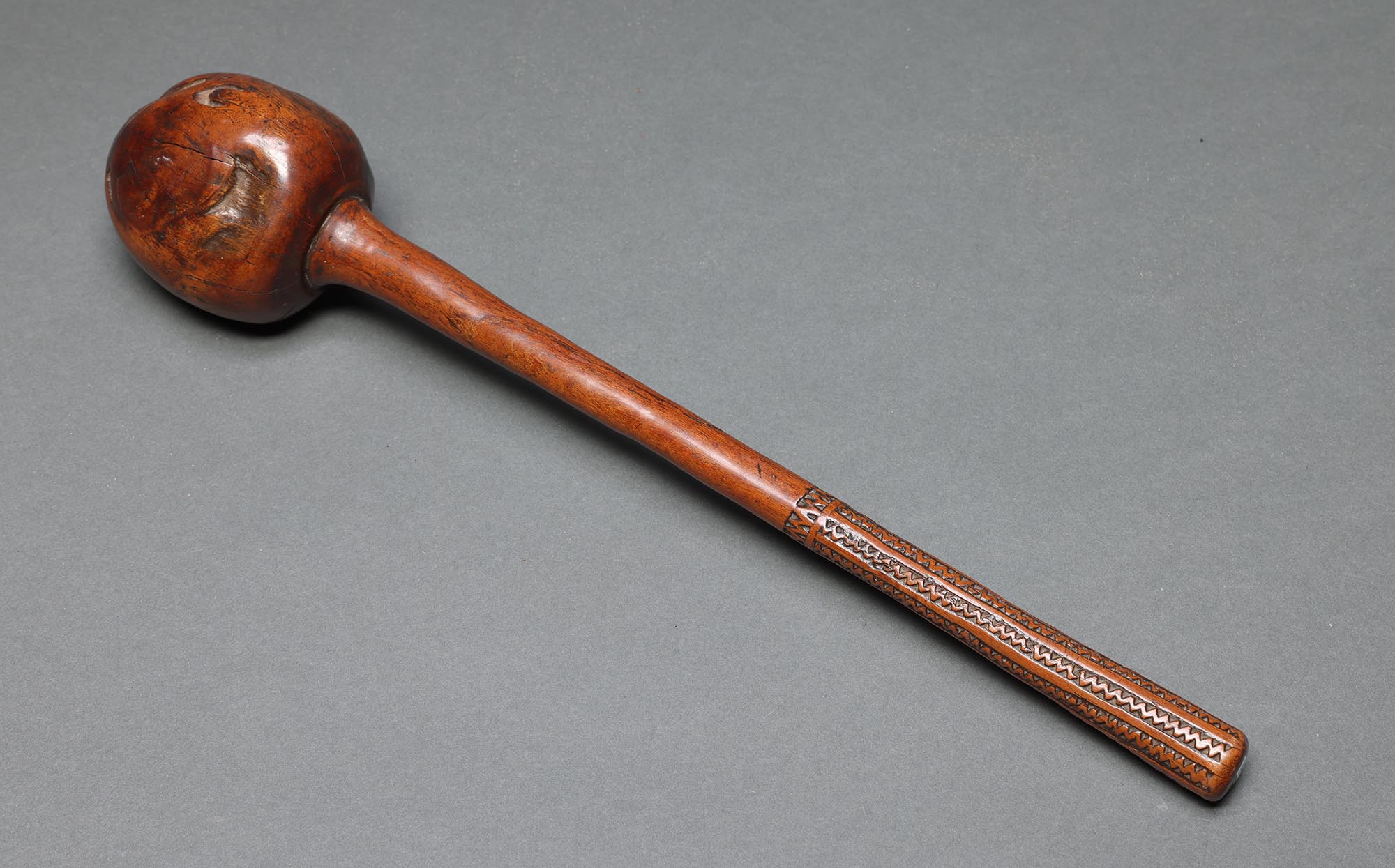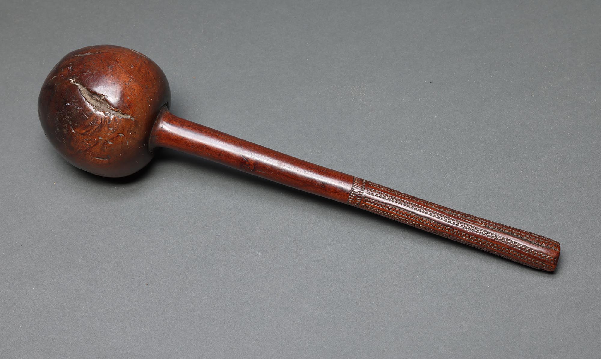 Made from the sacred Vesi wood, with a root ball at one end and fine geometric patterns at the other, quite possibly carved with a rat’s tooth. We note dots carved under the ball that may indicate the number of kills. Fijian warriors were expert marksmen, with their throwing clubs, ula, capable of striking the back of the head of a running enemy at a long distance, causing him to collapse.